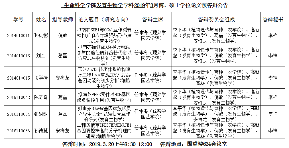 生命科学学院发育生物学学科2019年3月博、硕士学位论文预答辩公告