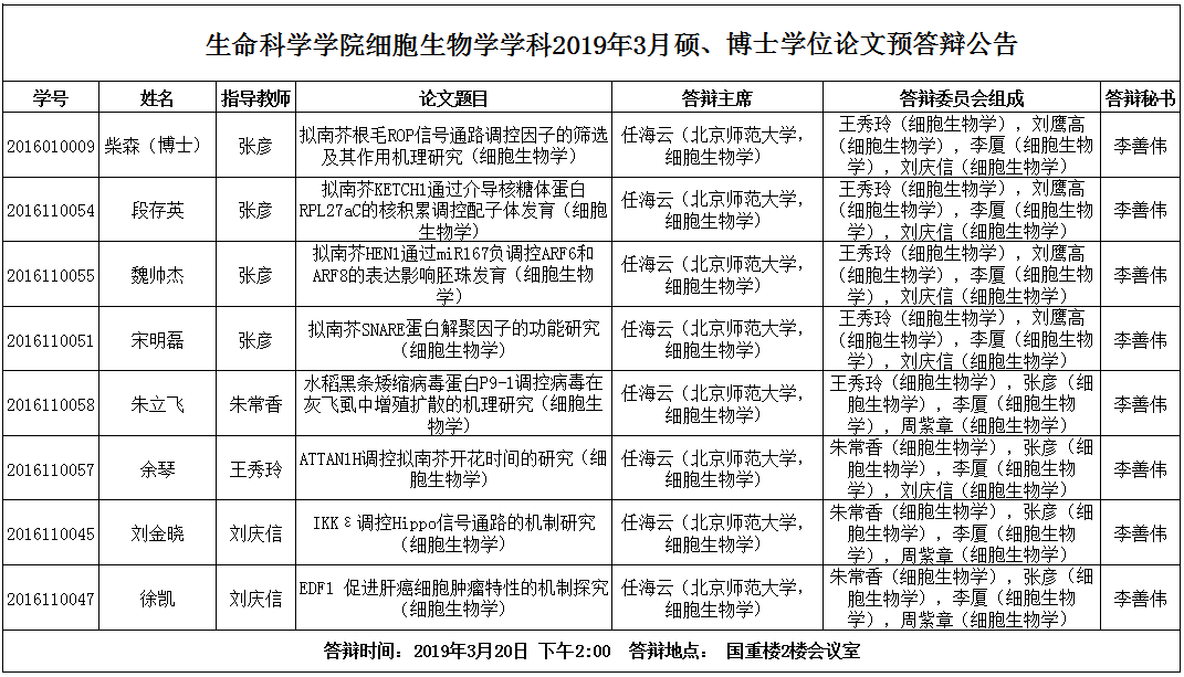 生命科学学院细胞生物学学科2019年3月博、硕士学位论文预答辩公告