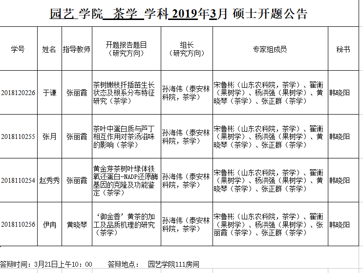 园艺 学院 茶学 学科 2019年3月 硕士开题公告